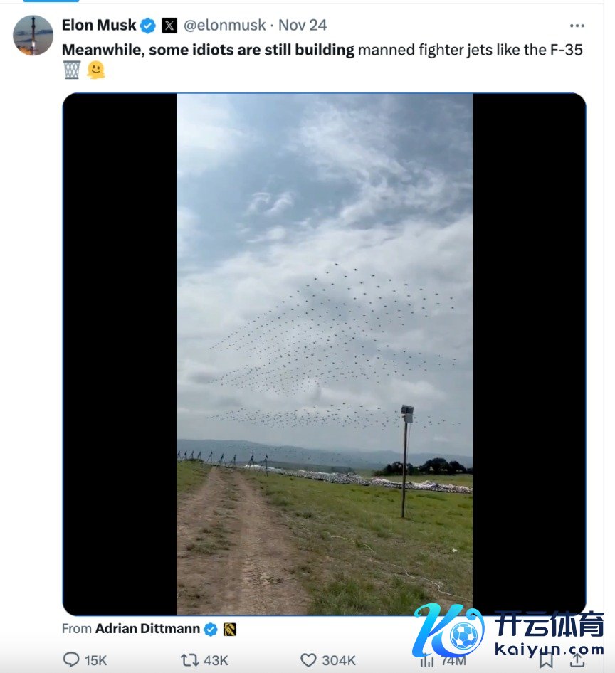 11月24日,特斯拉CEO马斯克在其个东谈主外交媒体账号上转发一则中国无东谈主机蜂群饰演的视频,并点评谈:“同期,一些傻子还在制造F-35那样的有东谈主驾驶战争机。”暗指好意思国F-35有东谈主驾驶战争机已落伍落后。马斯克干系词条飞速冲上热搜。