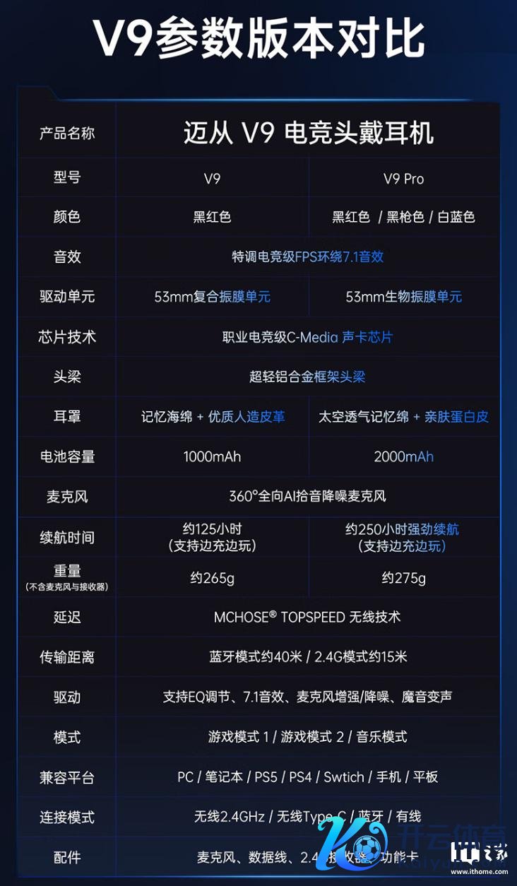 IT之家附迈从 V9 系列电竞头戴耳机参数版块对比如下:
