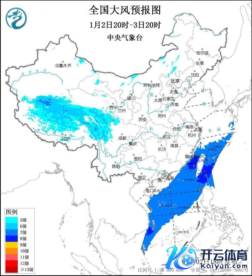 展望,1月2日20时至3日20时,西藏大部、青海中南部、川西高原、内蒙古中西部等地部分地区将有5~7级、阵风7~9级的大风;东海南部海域、台湾海峡、台湾以东瀛面、巴士海峡、南海大部海域将有7~8级、阵风9~10级的大风。