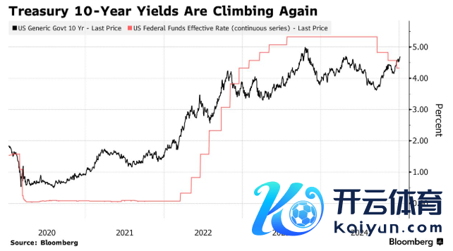 跟着投资者为特朗普第二任好意思国总统任期内的通胀计策作念好准备,该收益率周二从 9 月份的 3.60% 低点飙升至4.70%隔壁。经济的韧性促使来回员将对好意思联储下次降息四分之一个百分点的预期推迟到 7 月,这促使东谈主们再行想考收益率到底能涨到多高。