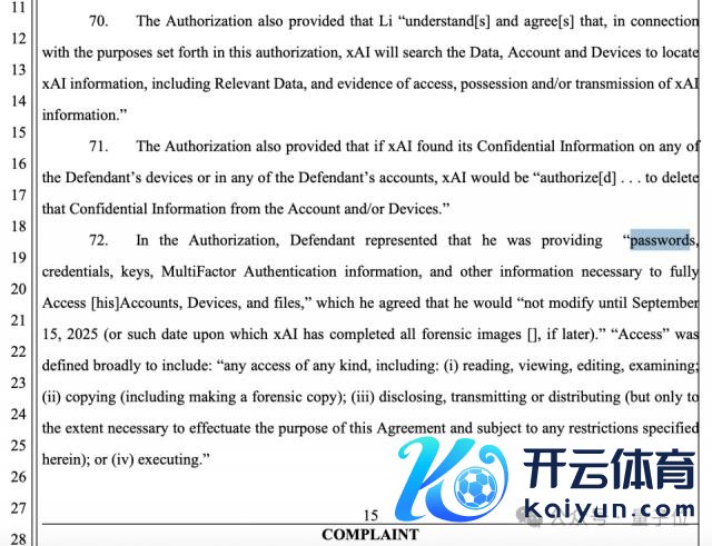 8 月 18 日,Xuechen Li 签署了一份"授权拜谒条约",提供了账号密码且 9 月 15 日前不会修改,并容许让 xAI 的取证众人拜谒他的个东谈主开荒和账户,以窥伺和删除公司的奥妙信息。