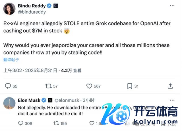 参考连气儿: [ 1 ] https://sfstandard.com/2025/08/29/xai-elon-musk-openai-stanford-sam-altman-ai-talent-wars/ [ 2 ] https://x.com/ns123abc/status/1961504323172798869 [ 3 ] https://www.reuters.com/legal/litigation/musks-xai-sues-engineer-allegedly-taking-secrets-openai-2025-08-29/kaiyun