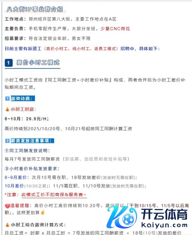 以八大街 iP 做事群为例,8 月到 10 月的高价小时工时薪为 26.5 元 / 小时,高价抓续到 10 月 20 日,10 月 21 号起按同工同酬诡计工资;纯小时工时薪在 75 天内为 24.5 元 / 小时,高价工期抓续 75 天,75 天后需下野;返费工模式下,在任本领工资由"独特返费(即奖金)+ 同工同酬"组成,工期不跳跃 5 个月,在任满 90 天,独特披发返费 8000 元,返费工昔时工资为同工同酬,即底薪 2100 元 + 加班费 + 夜班补贴等。以每个月工时 260 小时来算,高价小时工当月工资为 6890 元,纯小时工当月工资为 6370 元,返费工 3 个月预估笔直 19000 元到 22000 元。